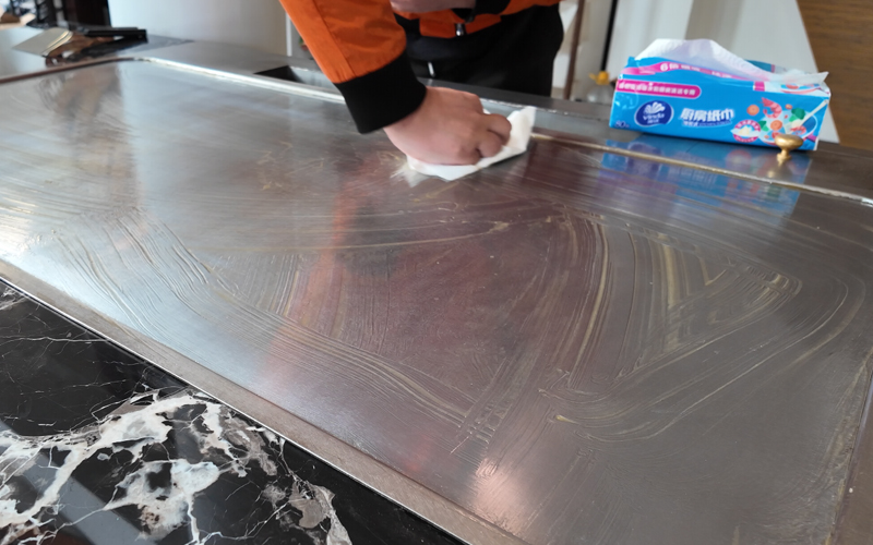 2、用鏟子清除臺(tái)面上的防銹保護(hù)油,用廚房用紙或毛巾將煎板擦拭干凈(或直接用廚房用紙擦拭)